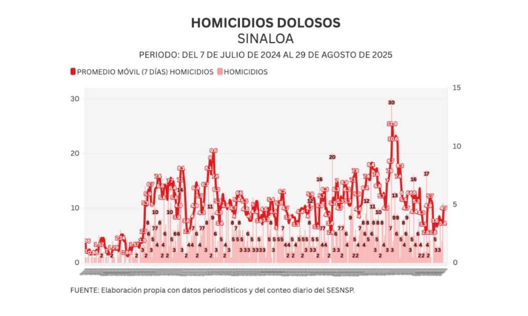 Noroeste calcula un promedio móvil diario de 7 días para medir con mayor sensibilidad la evolución del homicidio en Sinaloa. Al día de hoy, el promedio ascendió a 4.7 asesinatos diarios.