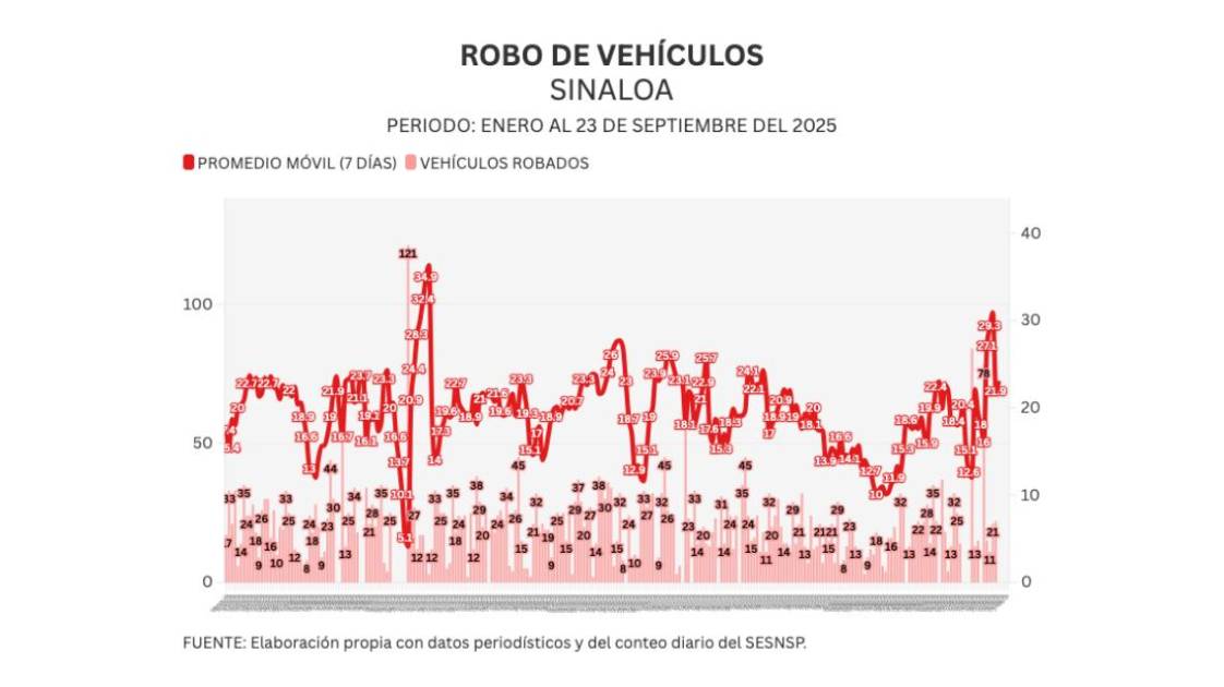 En robo de vehículo, en septiembre se han registrado 473 denuncias por ese delito según datos del Secretariado Ejecutivo de Sinaloa, para un promedio de 20.6 diarios.