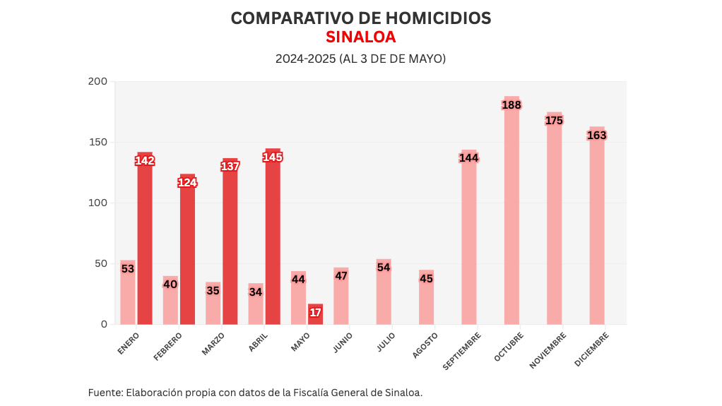 También Noroeste lleva un conteo mensual de acuerdo a lo registrado por el Secretariado Ejecutivo del Sistema Nacional de Seguridad Pública (SESNSP), en lo que va de mayo se han registrado 17 homicidios para un promedio de 5.7 diarios.