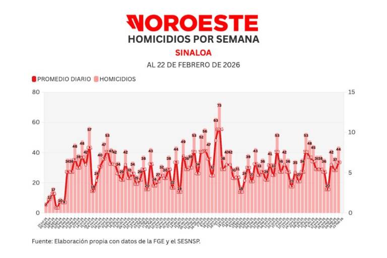 También Noroeste lleva un conteo mensual de acuerdo a lo registrado por el Secretariado Ejecutivo del Sistema Nacional de Seguridad Pública (SESNSP), en febrero se han registrado 126 homicidios para un promedio de 5.7 diarios.