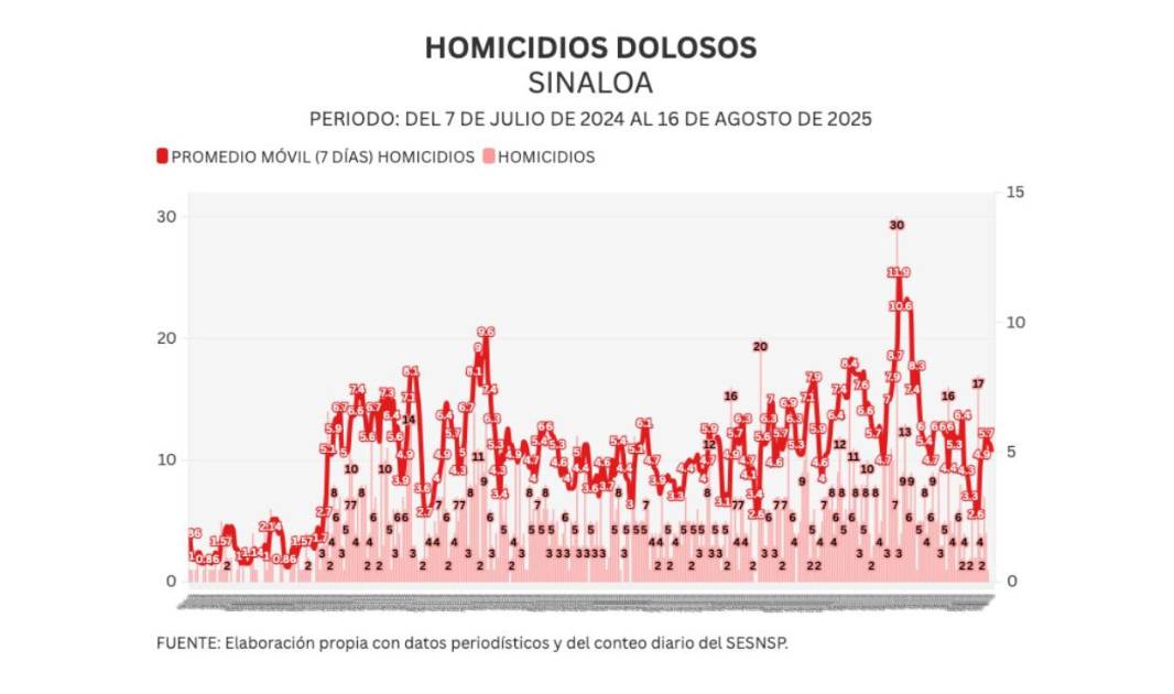 Noroeste calcula un promedio móvil diario de 7 días para medir con mayor sensibilidad la evolución del homicidio en Sinaloa. Al día de hoy, el promedio ascendió a 5.0 asesinatos diarios.