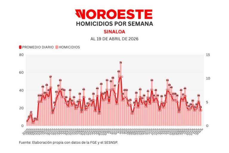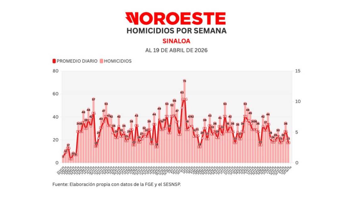 También Noroeste lleva un conteo mensual de acuerdo a lo registrado por el Secretariado Ejecutivo del Sistema Nacional de Seguridad Pública (SESNSP), en abril se han registrado 75 homicidios para un promedio de 3.9 diarios.