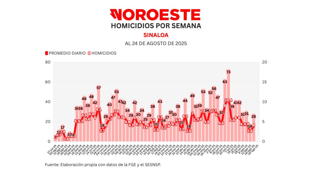 También Noroeste lleva un conteo mensual de acuerdo a lo registrado por el Secretariado Ejecutivo del Sistema Nacional de Seguridad Pública (SESNSP), en lo que va de agosto se registraron 91 homicidios para un promedio de 3.8 diarios.
