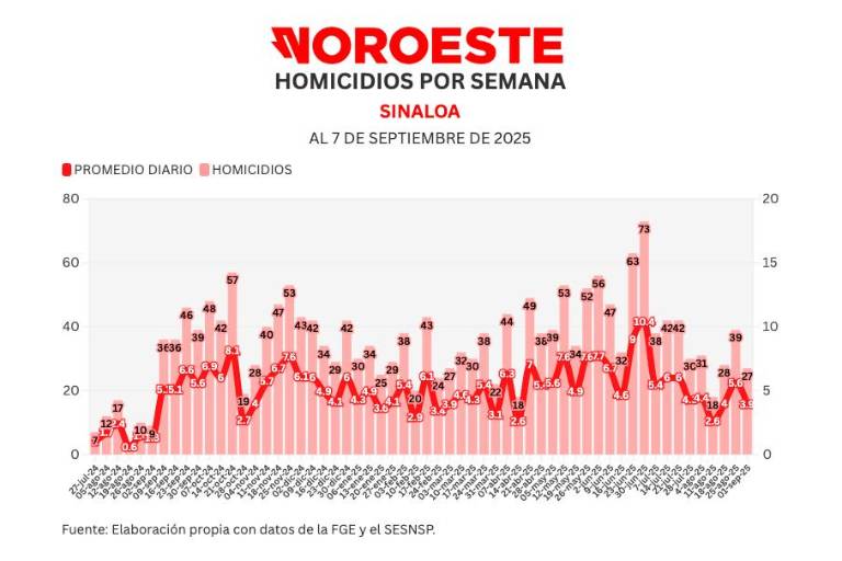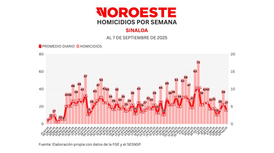 También Noroeste lleva un conteo mensual de acuerdo a lo registrado por el Secretariado Ejecutivo del Sistema Nacional de Seguridad Pública (SESNSP), en septiembre se han registrado 27 homicidios para un promedio de 3.9 diarios.