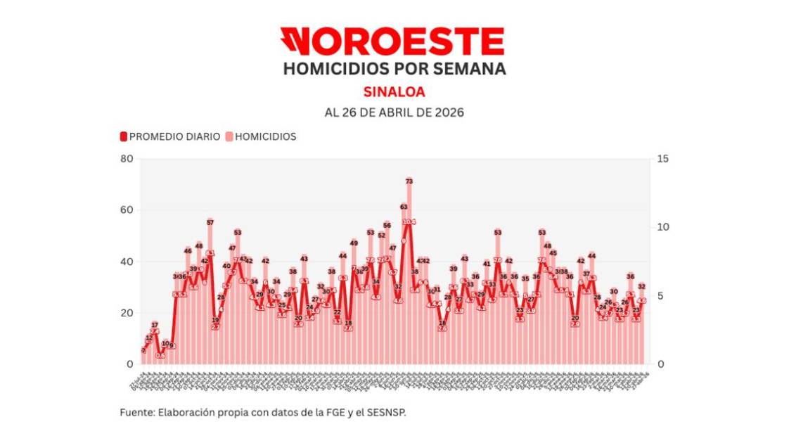 También Noroeste lleva un conteo mensual de acuerdo a lo registrado por el Secretariado Ejecutivo del Sistema Nacional de Seguridad Pública (SESNSP), en abril se han registrado 107 homicidios para un promedio de 4.1 diarios.
