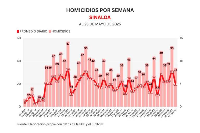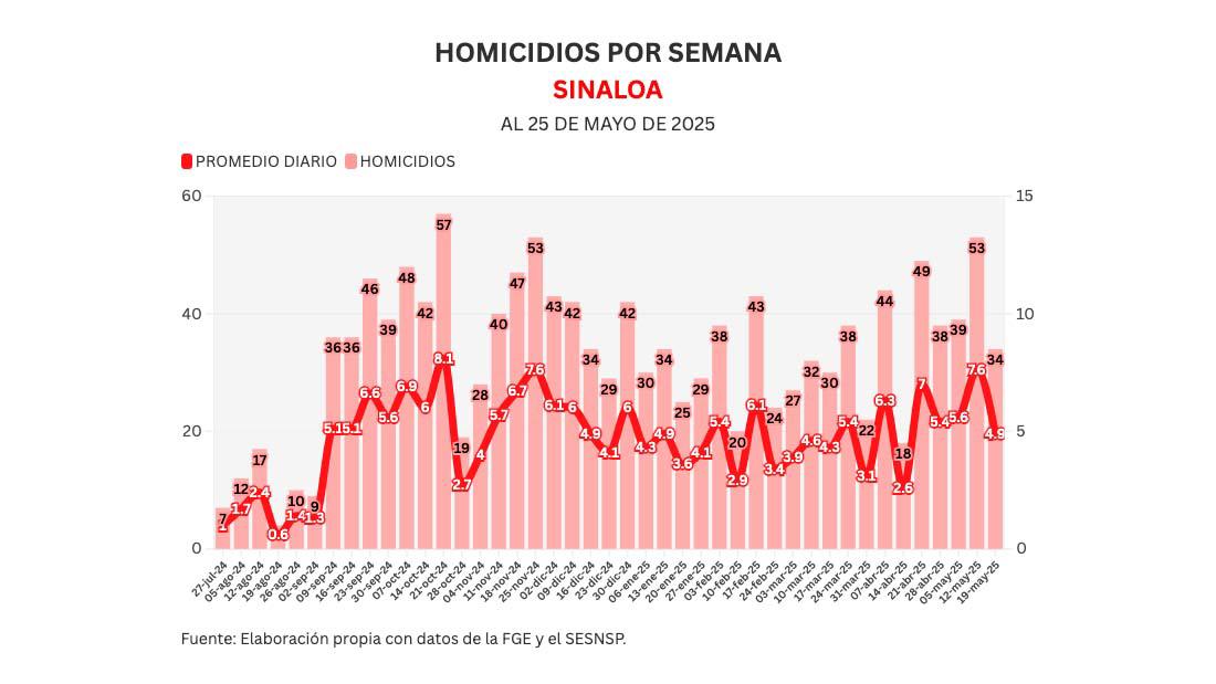 Noroeste calcula un promedio móvil diario de 7 días para medir con mayor sensibilidad la evolución del homicidio en Sinaloa. Al día de hoy, el promedio ascendió a 4.7 asesinatos diarios.