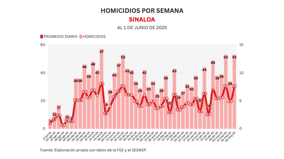 Noroeste calcula un promedio móvil diario de 7 días para medir con mayor sensibilidad la evolución del homicidio en Sinaloa. Al día de hoy, el promedio ascendió a 7.6 asesinatos diarios.