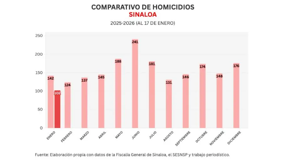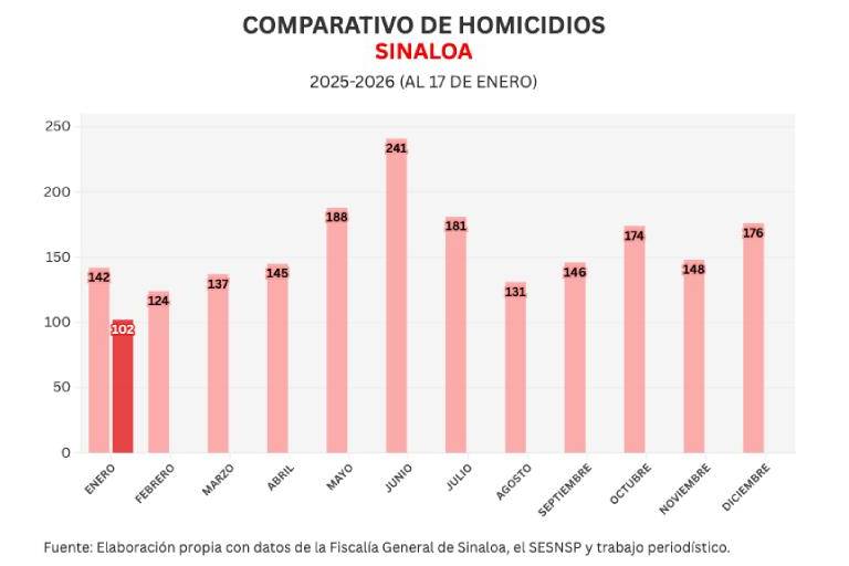 También Noroeste lleva un conteo mensual de acuerdo a lo registrado por el Secretariado Ejecutivo del Sistema Nacional de Seguridad Pública (SESNSP), en enero se han registrado 102 homicidios para un promedio de 6.0 diarios.