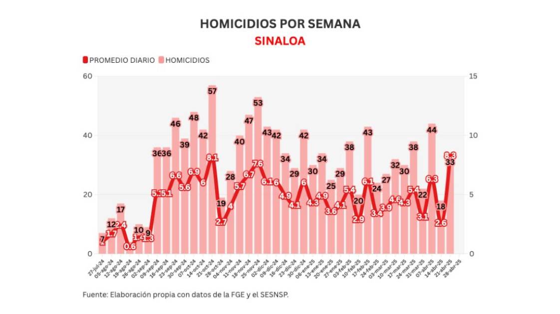 Noroeste calcula un promedio móvil diario de 7 días para medir con mayor sensibilidad la evolución del homicidio en Sinaloa. Al día de hoy, el promedio ascendió a 5.7 asesinatos diarios.