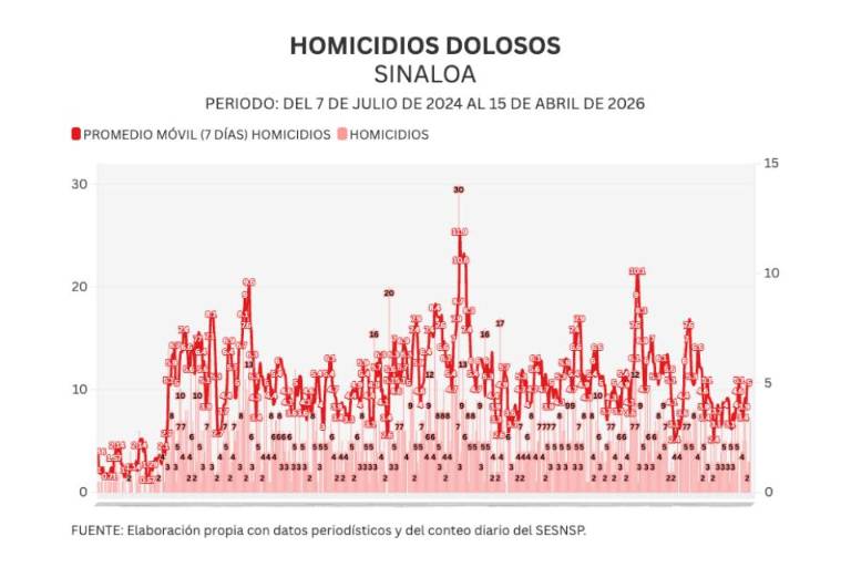 Noroeste calcula un promedio móvil diario de 7 días para medir con mayor sensibilidad la evolución del homicidio en Sinaloa. Al día de hoy, el promedio ascendió a 5.1 asesinatos diarios.