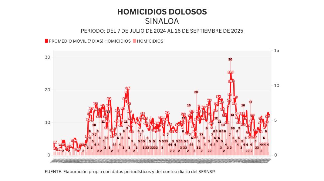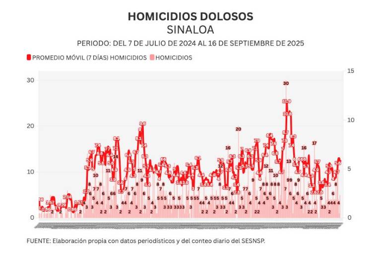 Con estos datos, la proyección de homicidios para septiembre es de 143, con lo que Sinaloa perdería la tendencia descendente en este delito.