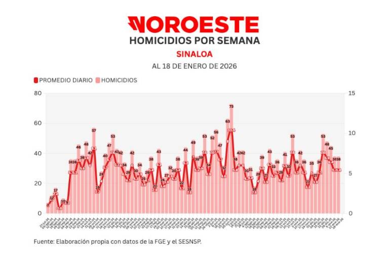 Este domingo 18 de enero se registraron cuatro homicidios en Sinaloa, con lo que la semana concluyó con 38 homicidios para un promedio de 5.4 diarios.