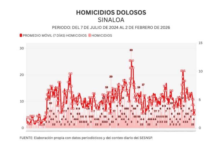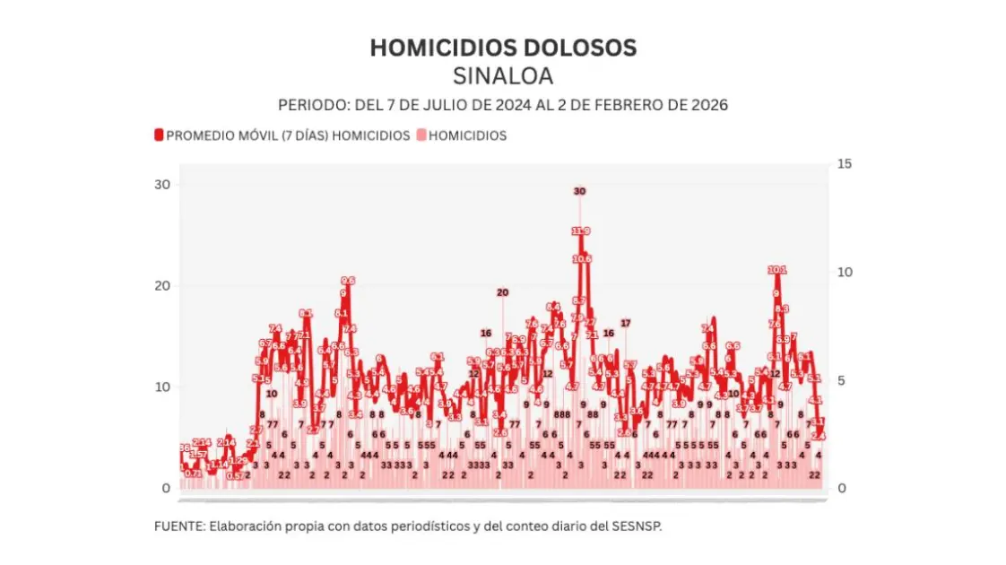 Noroeste calcula un promedio móvil diario de 7 días para medir con mayor sensibilidad la evolución del homicidio en Sinaloa. Al día de hoy, el promedio ascendió a 3.3 asesinatos diarios.