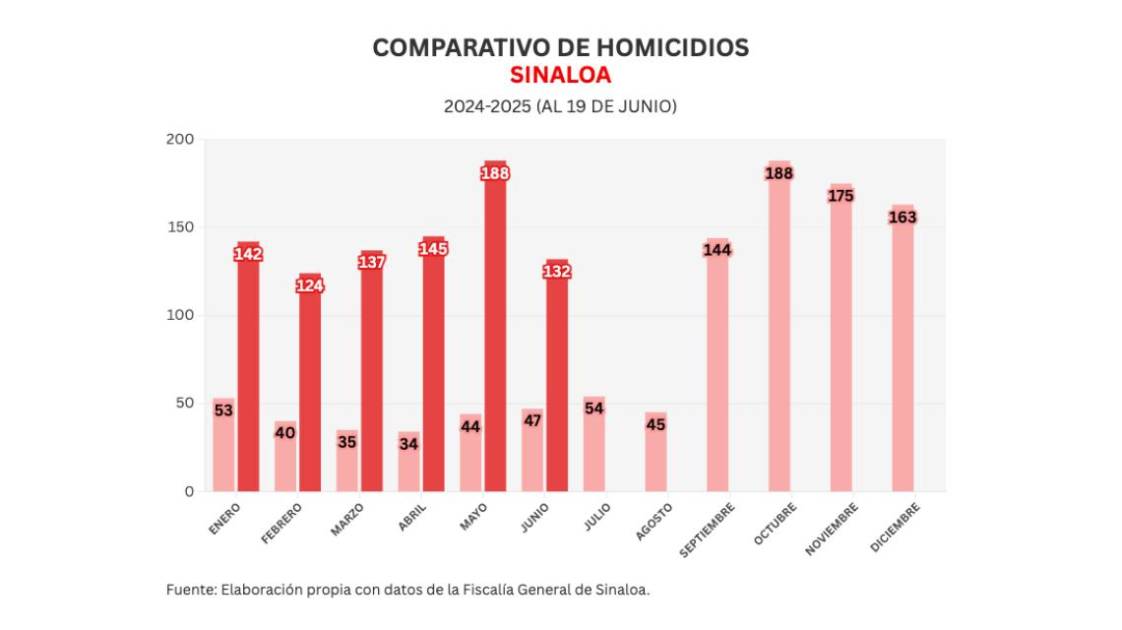 También Noroeste lleva un conteo mensual de acuerdo a lo registrado por el Secretariado Ejecutivo del Sistema Nacional de Seguridad Pública (SESNSP), en lo que va de junio se han registrado 132 homicidios para un promedio de 6.9 diarios.