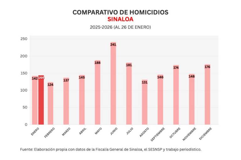 También Noroeste lleva un conteo mensual de acuerdo a lo registrado por el Secretariado Ejecutivo del Sistema Nacional de Seguridad Pública (SESNSP), en enero se han registrado 144 homicidios para un promedio de 5.5 diarios.