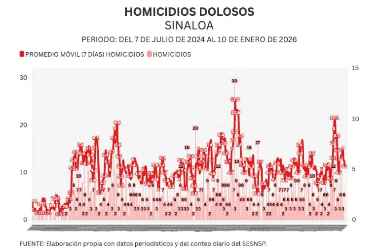 Noroeste calcula un promedio móvil diario de 7 días para medir con mayor sensibilidad la evolución del homicidio en Sinaloa. Al día de hoy, el promedio ascendió a 5.3 asesinatos diarios.