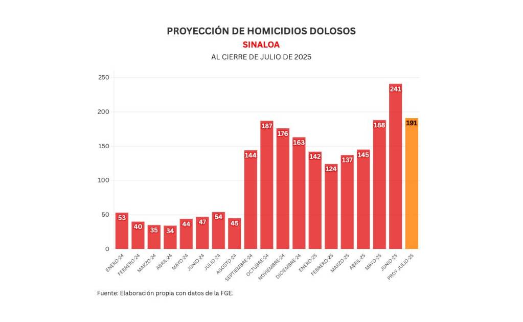 Con estos datos, la proyección de asesinatos para julio de 2025 es de 191.