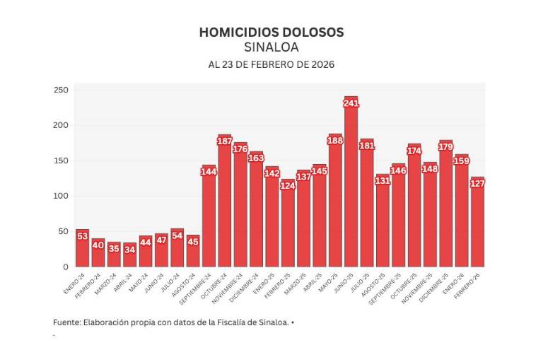 También Noroeste lleva un conteo mensual de acuerdo a lo registrado por el Secretariado Ejecutivo del Sistema Nacional de Seguridad Pública (SESNSP), en febrero se han registrado 127 homicidios para un promedio de 5.5 diarios.