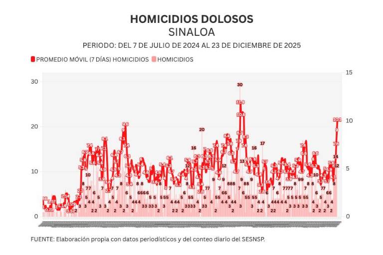 Noroeste calcula un promedio móvil diario de 7 días para medir con mayor sensibilidad la evolución del homicidio en Sinaloa. Al día de hoy, el promedio ascendió a 10.1 asesinatos diarios.