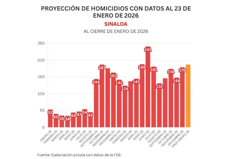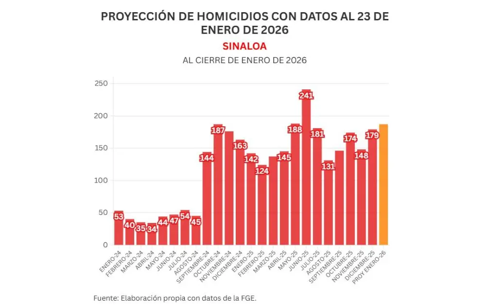 Por otro lado, un motopatrullero del Grupo Jaguar de la Policía Municipal de Mazatlán fue asesinado mientras trabajaba en la colonia Loma Bonita, en Mazatlán, cuyo caso quedó registrado en la carpeta de investigación por el delito de “homicidio por agresión a la autoridad” pero que no se agregó al conteo de homicidios mensual. Es el sexto policía asesinado en los 23 días de enero de 2026.