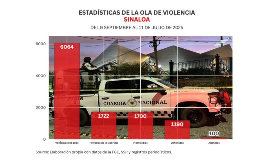 Con estos datos, Sinaloa alcanzó la cifra de mil 700 homicidios en el contexto de la Ola violenta y la proyección de asesinatos para julio de 2025 es de 201.