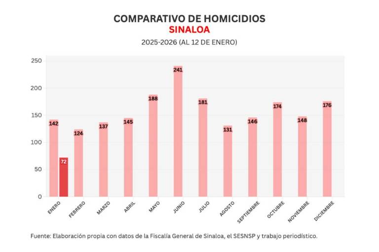 También Noroeste lleva un conteo mensual de acuerdo a lo registrado por el Secretariado Ejecutivo del Sistema Nacional de Seguridad Pública (SESNSP), en enero se han registrado 72 homicidios para un promedio de 6.0 diarios.