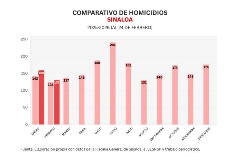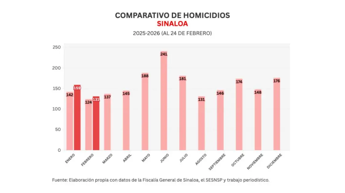 También Noroeste lleva un conteo mensual de acuerdo a lo registrado por el Secretariado Ejecutivo del Sistema Nacional de Seguridad Pública (SESNSP), en febrero se han registrado 131 homicidios para un promedio de 5.5 diarios.