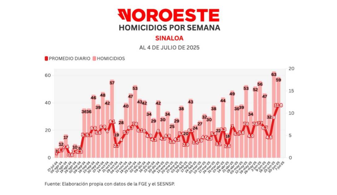 También Noroeste lleva un conteo mensual de acuerdo a lo registrado por el Secretariado Ejecutivo del Sistema Nacional de Seguridad Pública (SESNSP), en lo que va de julio se registraron 29 homicidios para un promedio de 7.3 diarios.