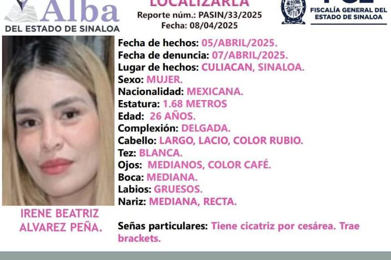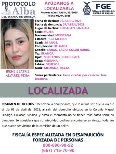 CULIACÁN. _ Después de alrededor de 40 días, Irene Beatriz fue localizada con vida, de acuerdo con la Fiscalía General del Estado (FGE).