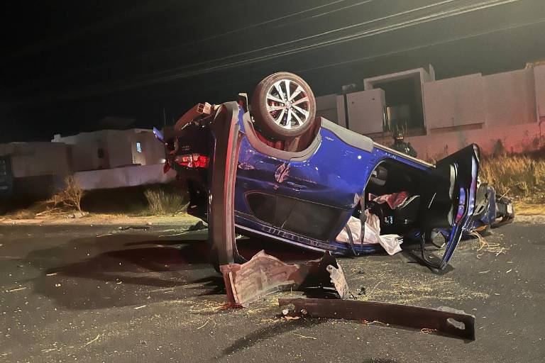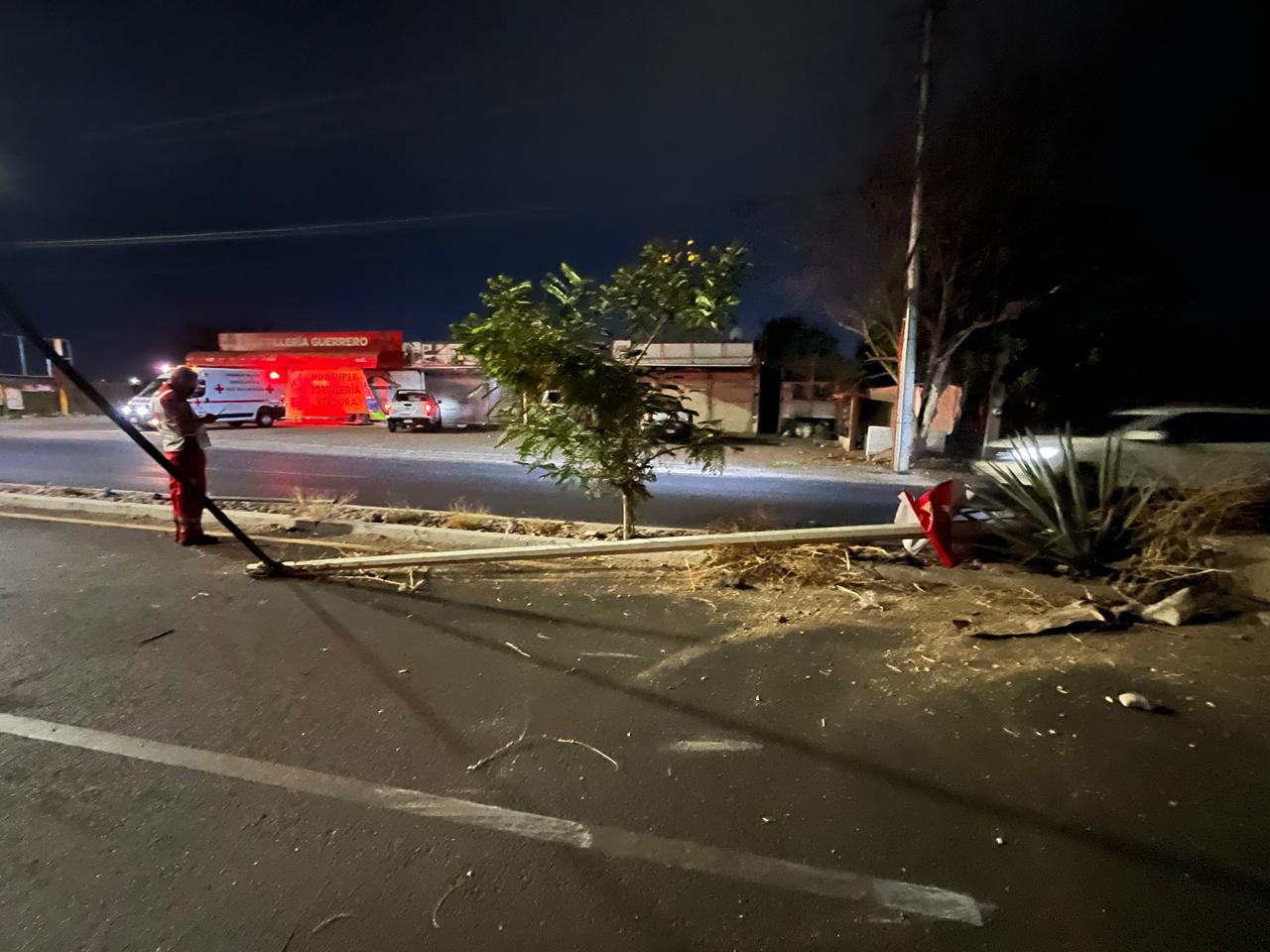 El poste fue derribado durante el impacto y el vehículo resultó con al menos un neumático desprendido, además de que sufrió daños notorios en la defensa trasera y en demás zonas frontales de la carrocería.