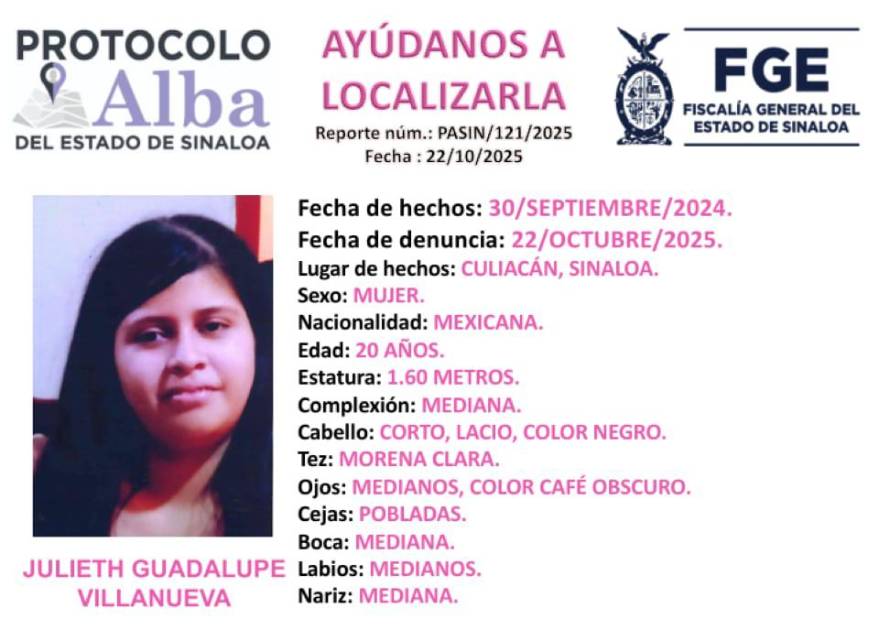 CULIACÁN._ La Fiscalía General del Estado de Sinaloa, a través de la Fiscalía Especializada en Desaparición Forzada de Personas, emitió una ficha de búsqueda y activó el Protocolo Alba para localizar a Julieth Guadalupe Villanueva, de 20 años, quien fue reportada como desaparecida en Culiacán.