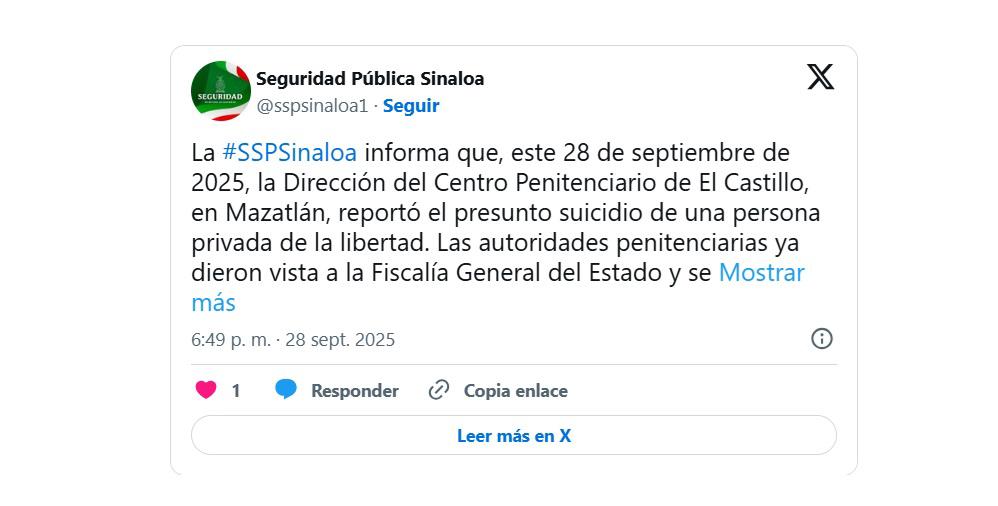 Mazatlán._ La Secretaría de Seguridad Pública del Estado informó, a través de su cuenta oficial en la red social X, sobre el fallecimiento de un reo en el penal de Mazatlán.