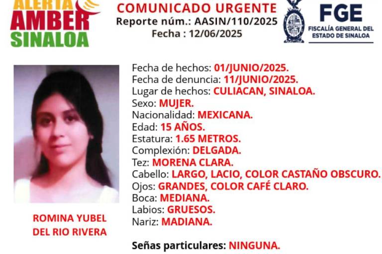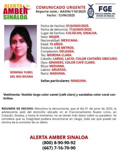 CULIACÁN. _ La Fiscalía General del Estado de Sinaloa activó una Alerta Amber para solicitar la colaboración de la ciudadanía en la localización de Romina Yubel “N”, una adolescente de 15 años de edad, reportada como desaparecida desde el pasado 1 de junio de 2025.