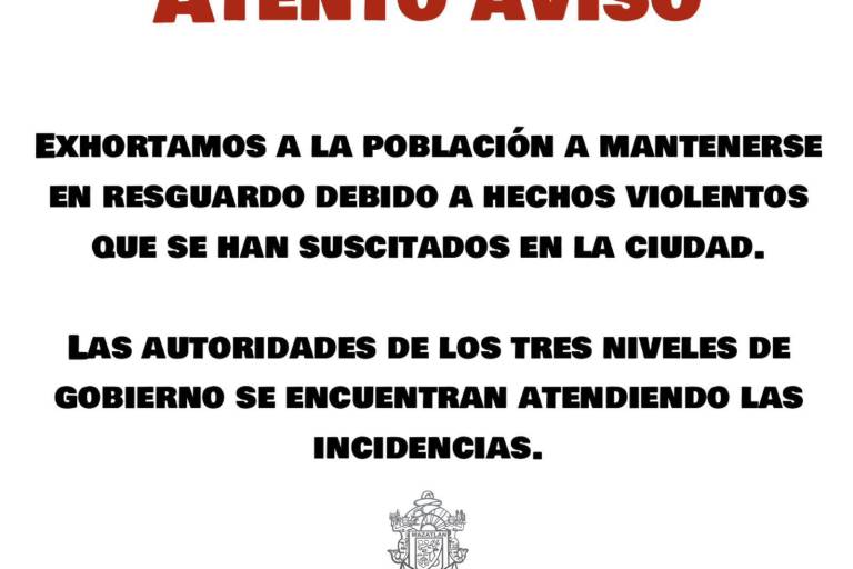 Exhortamos a la población a mantenerse en resguardo debido a los hechos violentos que se han sucitado en la ciudad.