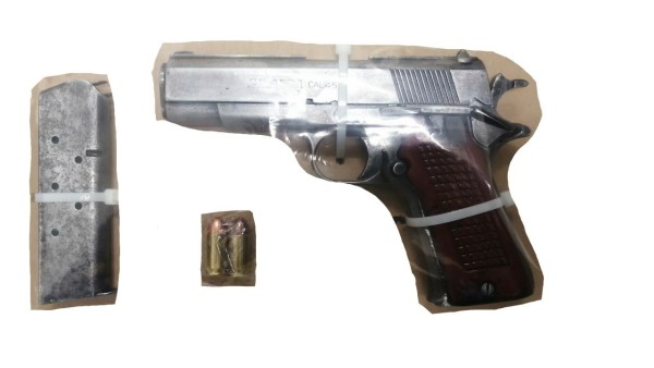 Al realizar la inspección en el vehículo, los agentes localizaron en el asiento del conductor una pistola con la leyenda “CAL. 45”, con un cargador abastecido con dos cartuchos útiles al parecer calibre 45 milímetros.