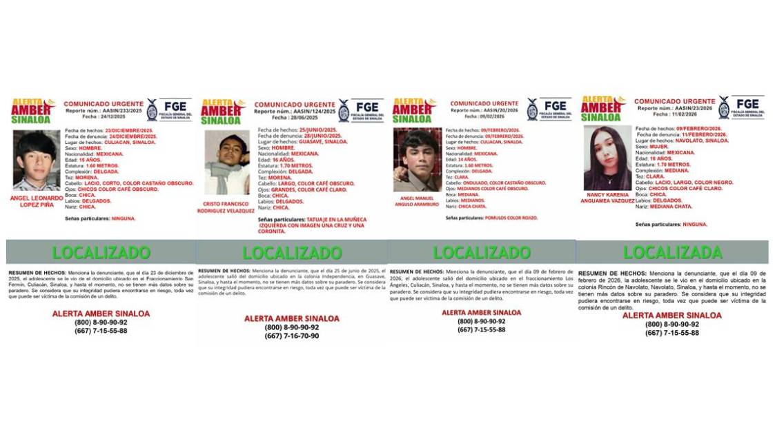 También se localizó con vida a Ángel Manuel Angulo Aramburo, de 14 años, desaparecido este 9 de febrero en Culiacán; y a Nancy Karenia Anguamea Velázquez, de 16 años, reportada como extraviada en Navolato el 11 de febrero.