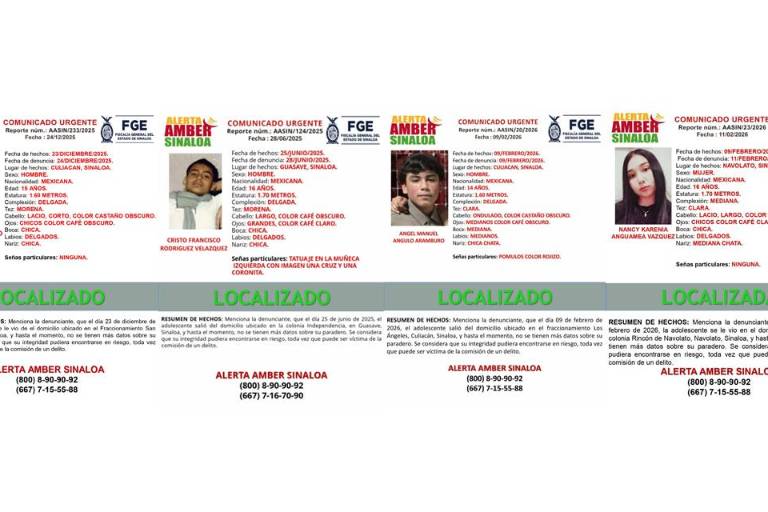 La Fiscalía General del Estado informó sobre la localización de cuatro menores de edad que habían sido reportados como desaparecidos en distintos puntos de Sinaloa.