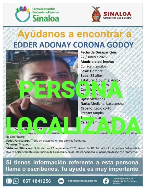 La Comisión Estatal de Búsqueda de Personas de Sinaloa actualizó su estatus con una ficha marcada como “localizado”.