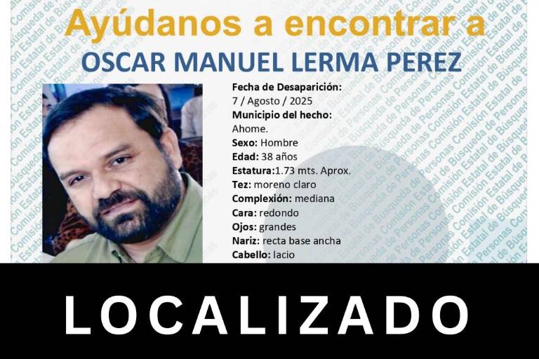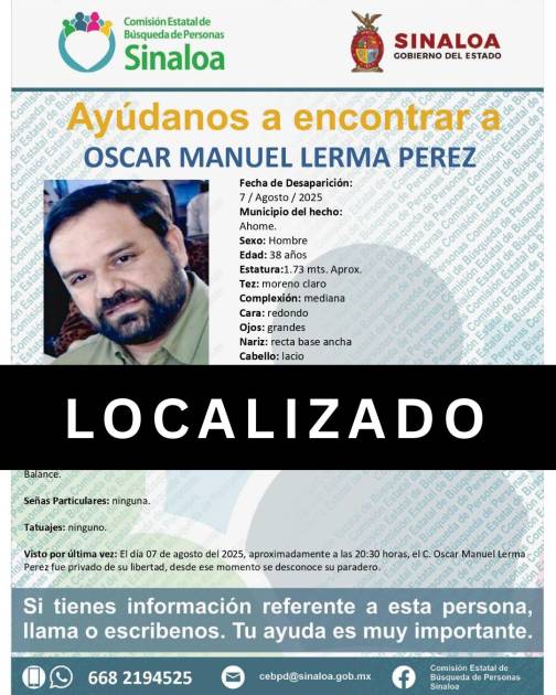 AHOME. _ Óscar Manuel, de 38 años de edad, quien había sido reportado como desaparecido desde el pasado 7 de agosto en el municipio de Ahome, fue localizado con vida la madrugada del 19 de agosto, según se dio a conocer a través de redes sociales.
