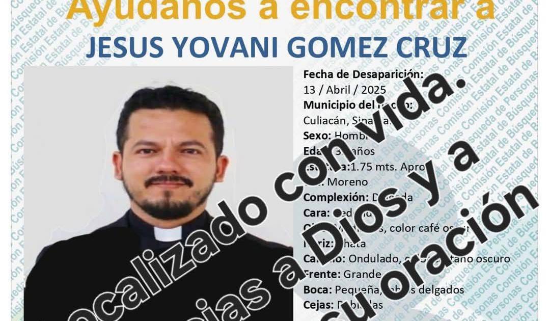 La Diócesis de Culiacán confirmó la localización del sacerdote Jesús Yovani, quien fue encontrado con vida luego se haber sido reportado como desaparecido la tarde de este lunes en El Tamarindo, Culiacán.