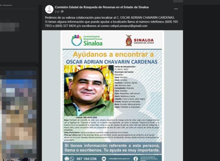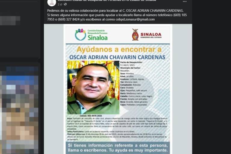 MAZATLÁN._ Este viernes fue localizado sin vida Óscar Adrián “N”, quien se encontraba desaparecido desde la noche del domingo 9 de abril, según información de la ficha de búsqueda emitida por la Comisión Estatal de Búsqueda de Personas en el Estado de Sinaloa.