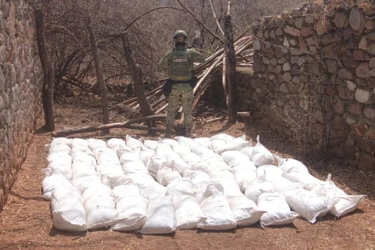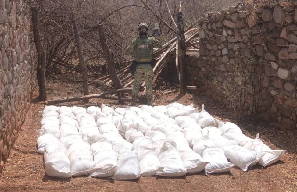 En un segundo hecho, el personal militar confiscó mil 800 kilos de sosa cáustica y otros mil 750 de ácido tartárico en un asentamiento clandestino de la comunidad Bacayopa, en Choix.