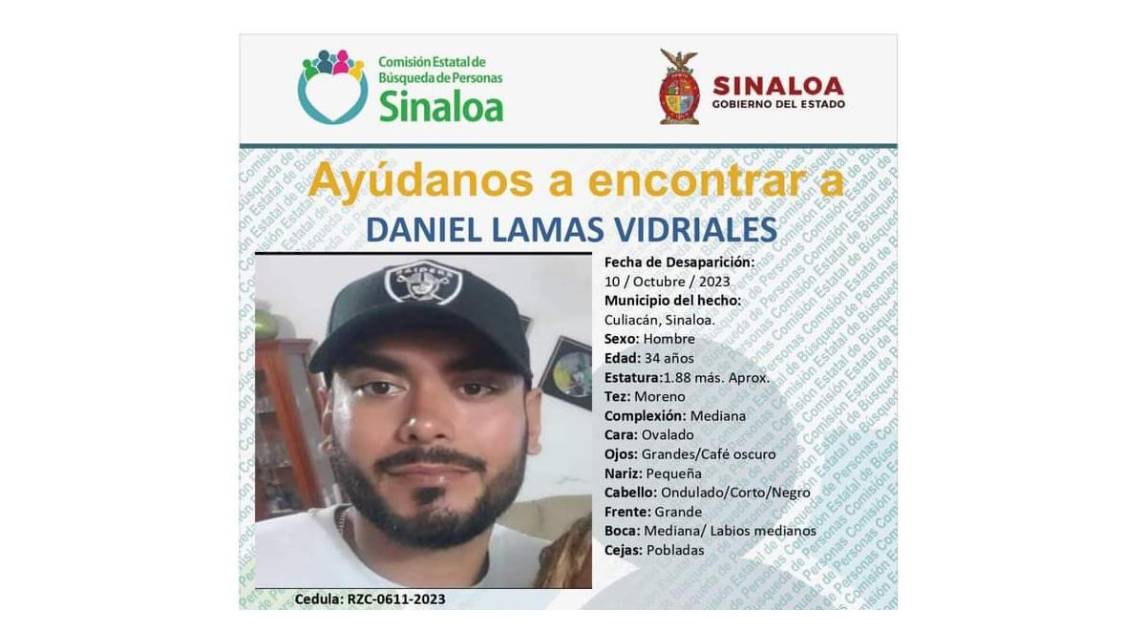 Familiares y autoridades se mantienen en la búsqueda de Daniel Lamas Vidriales, quien se encuentra reportado como desaparecido en la Comisión Estatal de Búsqueda de Personas de Sinaloa.