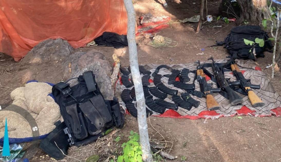 Durante recorridos terrestres y aéreos, el personal naval ubicó el sitio, donde fueron aseguradas tres armas largas, cargadores, 779 cartuchos calibre 7.62 mm, 75 cartuchos calibre .50, un artefacto explosivo improvisado y chalecos tácticos.