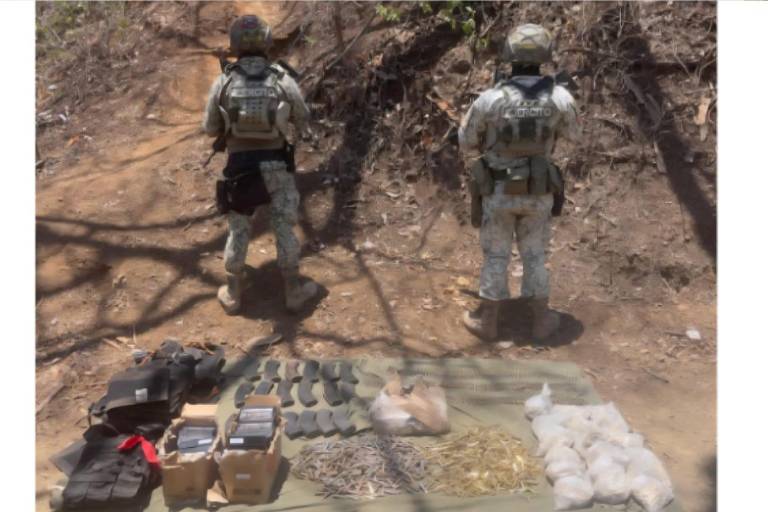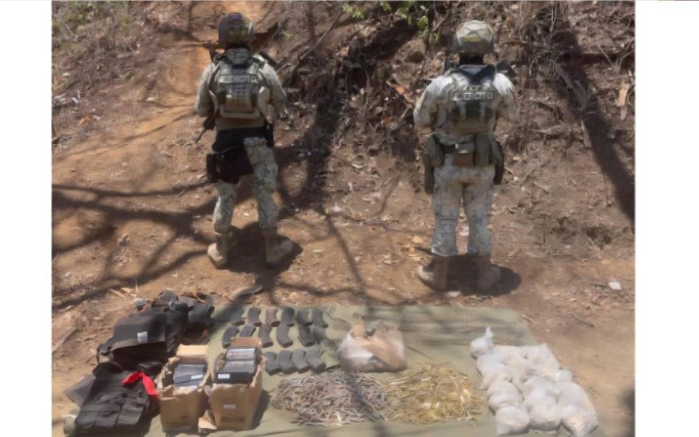El hallazgo ocurrió en las inmediaciones del poblado San Juan de Jacobo, donde personal militar realizaba labores terrestres y localizó cargadores para armas largas y chalecos tácticos.