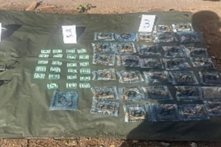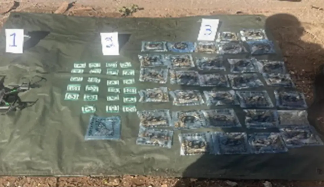 Al abrirla, encontraron un dron, así como 23 dosis de polvo blanco con características de cocaína y 32 dosis de hierba verde con características de marihuana.