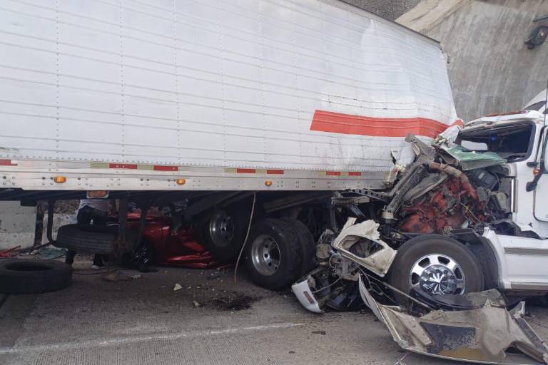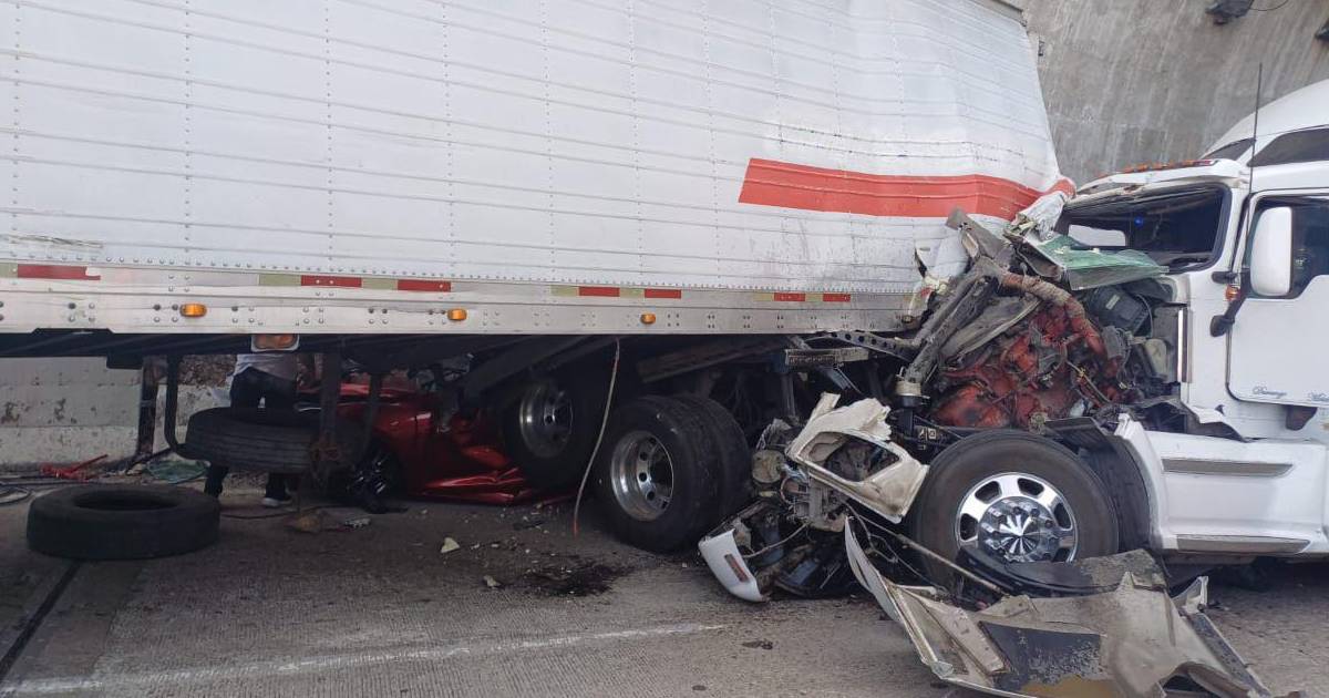 Se informó que un tráiler se quedó sin frenos y se impactó contra un automóvil y este terminó prensado contra la caja de otro tráiler.