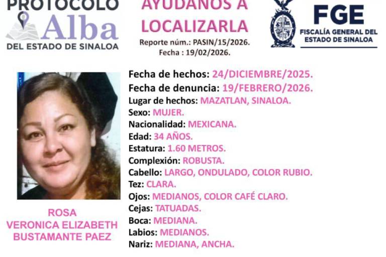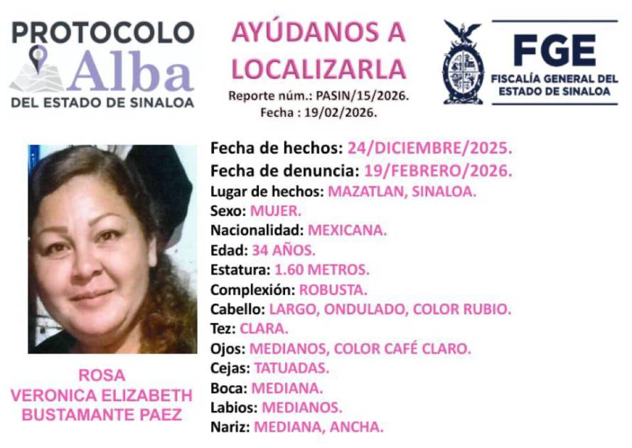 La Fiscalía General del Estado activó una ficha de búsqueda bajo Protocolo Alba por la desaparición en Mazatlán de Rosa Verónica Elizabeth Bustamante Páez.