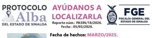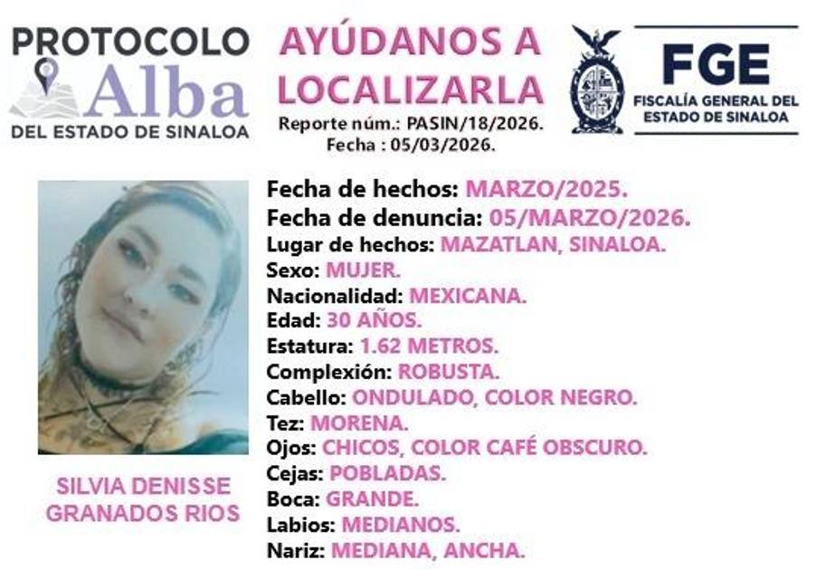 La Fiscalía Especializada en Desaparición Forzada de Personas emitió una ficha de búsqueda bajo el Protocolo Alba para localizar a Silvia Denisse Granados Ríos, desaparecida hace un año en Mazatlán.