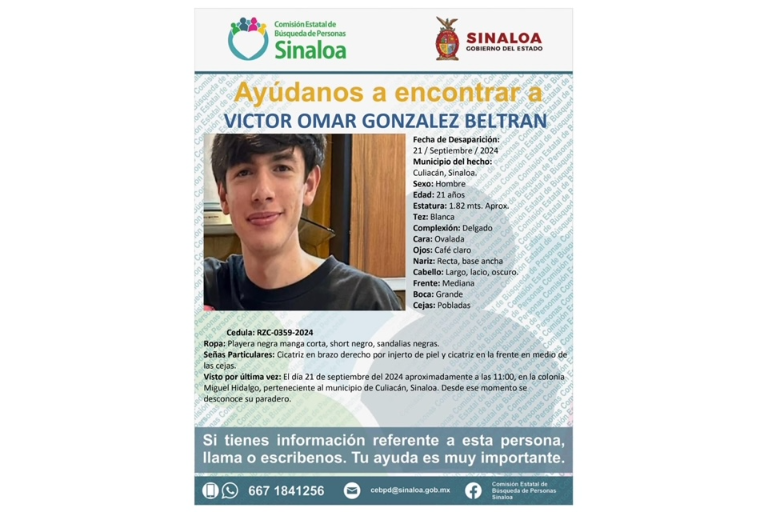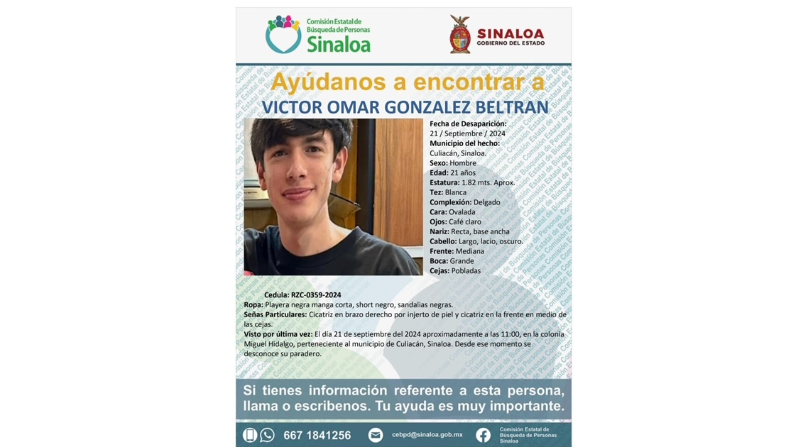 Víctor Omar, de 21 años, fue visto por última vez en las calles de la colonia Miguel Hidalgo, cerca del centro de Culiacán.